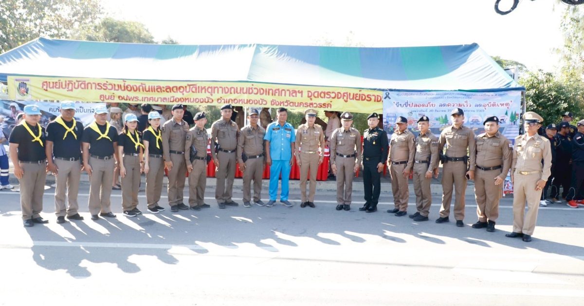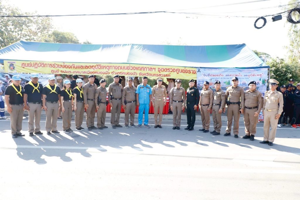 พ.ต.อ.พีระศักดิ์ สุทธิสวรรค์ ผกก.สภ.หนองบัว ร่วมพิธีเปิดศูนย์ป้องกันและลดอุบัติเหตุทางถนนในช่วงเทศกาลปีใหม่ 2569 โดยมีกำลังเจ้าหน้าที่ตำรวจและชุดจิตอาสาเข้าร่วมกิจกรรม เพื่ออำนวยความสะดวกการจราจร และประชาสัมพันธ์การป้องกันและลดอุบัติเหตุในช่วงเทศกาลปีใหม่ 2569