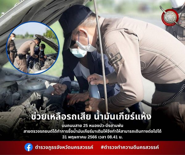 วันที่ 31 พ.ค.66 เวลา 08.33 น. ร.ต.อ.ศราวุธ นัยวิจารณ์ รอง สว.(ป.) สภ.หนองบัว (ร้อยเวร 20) , ร.ต.ต.วสันต์ พวงสมบัติ รอง สว.(ป.) สภ.หนองบัว และ ส.ต.ต.พูลสิทธิ์ ปิ่นแก้ว ผบ.หมู่ (ป.) สภ.หนองบัว ปฏิบัติหน้าที่สายตรวจรถยนต์ ขณะออกตรวจป้องกันเหตุในเขตพื้นที่รับผิดชอบ ได้รับแจ้งจากศูนย์สื่อสาร สภ.หนองบัว ว่ามีผู้ขอความช่วยเหลือเนื่องจากรถเสีย น้ำมันเกียร์แห้ง บนถนนสาย 25 หนองบัว-บึงสามพัน เลยสี่แยกหนองบัวไปประมาณ 2 กม. ทราบชื่อ นายขจรศักดิ์ จันทร์ประสิทธิ์ สายตรวจรถยนต์จึงได้ชื้อน้ำมันเกียร์มาเติมให้จึงทำให้สามารถเดินทางต่อไปได้